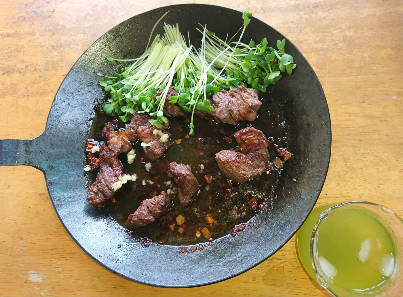 こんにちは、tomkkです。自分は、タバコも好きですが、料理も同じくらい大好きなので、今日は、つい最近購入して馴染んできた、タークのフライパンについて紹介したいと思います。画像は、ガーリックステーキ(スプラウトを添えて)と棒茶の冷茶です。