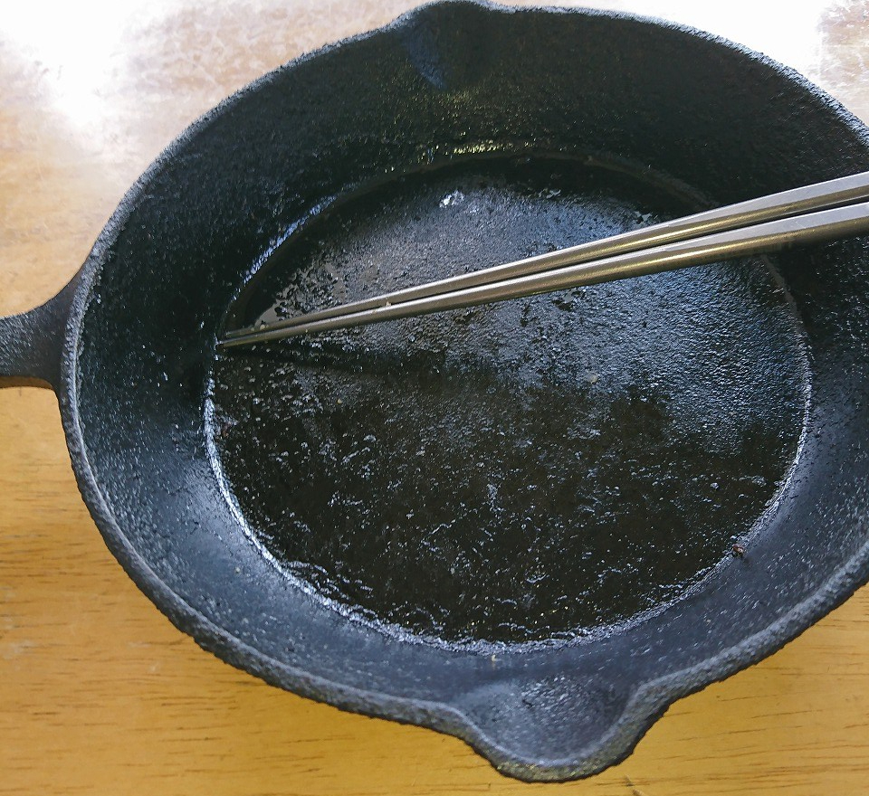終わった後は、スキレットをお湯でたわしなどで洗い火にかけ、煙が出るまで水分を飛ばします。