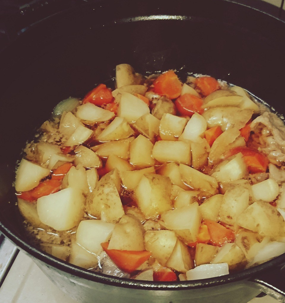 3.煙が出るまでストウブを熱したら、油を入れ、ストウブにうまみ・水分が出る順になるべく入れる。(玉ねぎに焼き目をつけるために最初に入れる。次に、肉、ニンジン、ジャガイモの順に入れていく。)