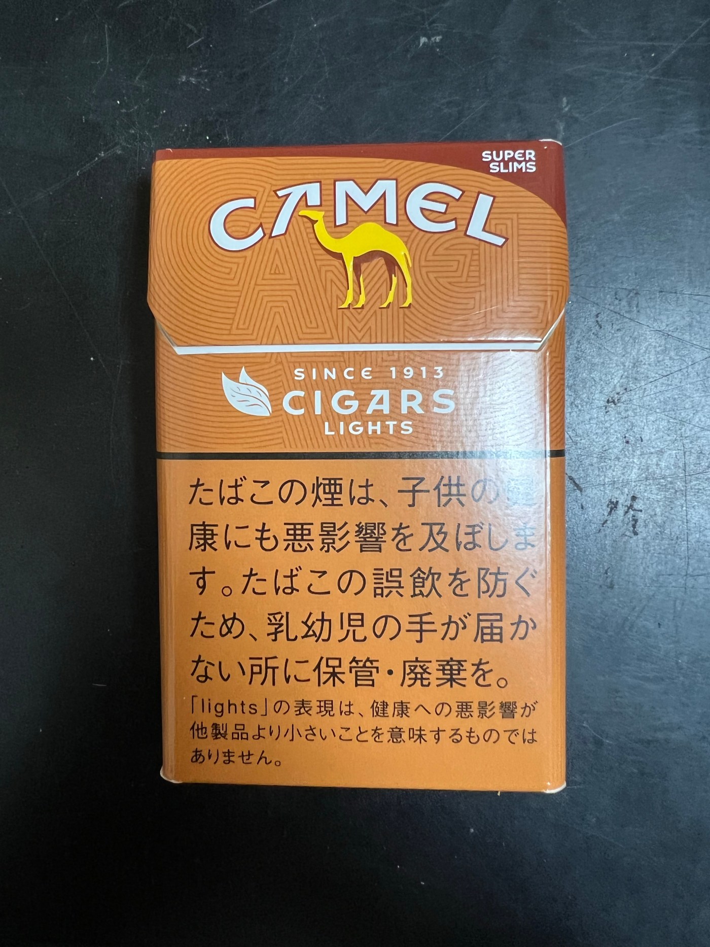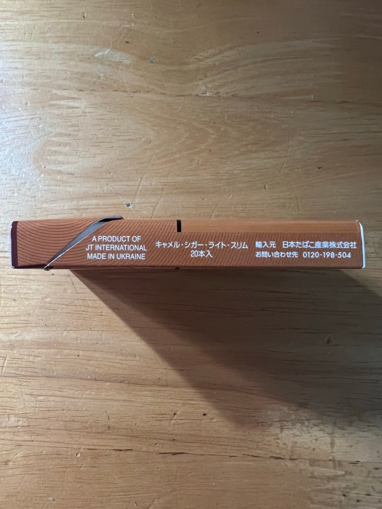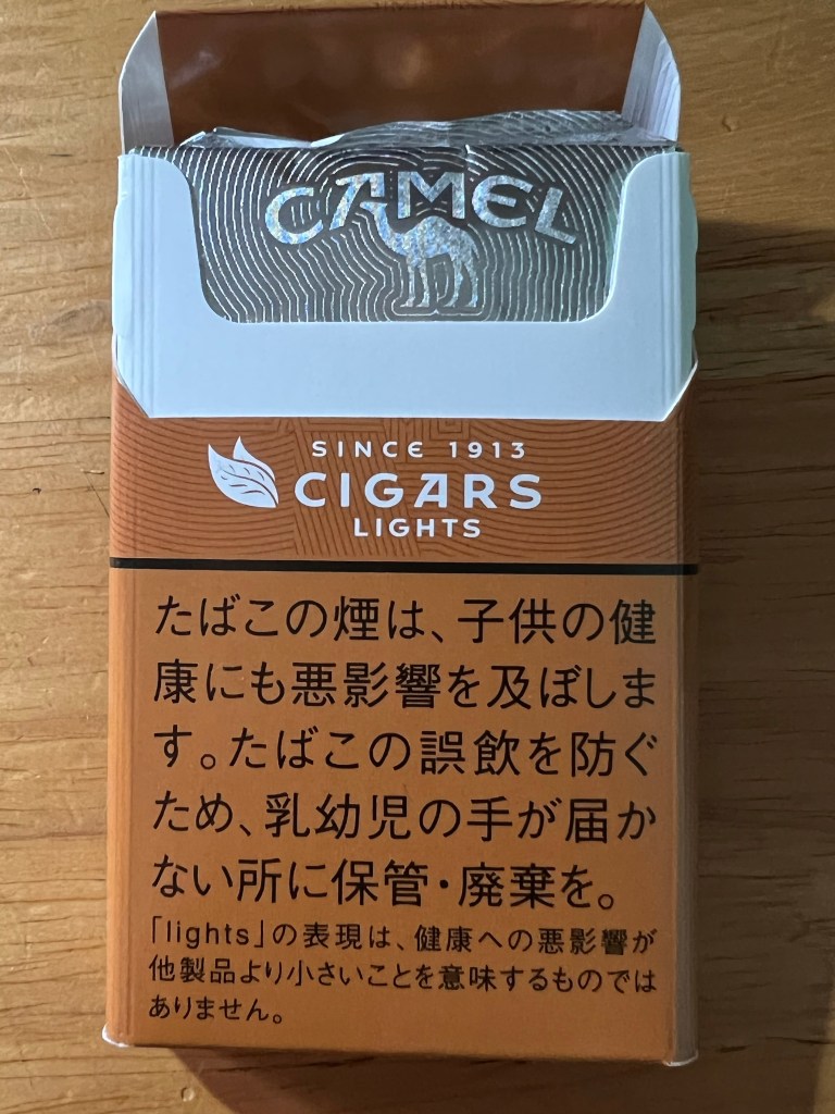 前置きは、このくらいにして、パッケージのデザインにも幾重にも「CAMEL」と書いてあります。吸う前の匂いは、ハチミツ?、キャラメル?メープルシロップが一番近いか?の匂いです。かなり細いです。わかばやエコーもそうですが、リトルシガーは、筆者の体感では、結構強いタバコというイメージです。それと、1分たたずに放っておくと火が消えました。ちなみに、リトルシガーは、ニコチンとタールの表記がありません。