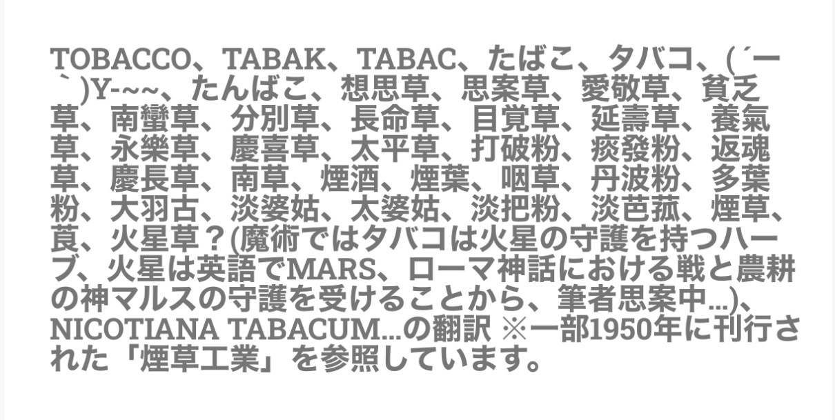 筆者の翻訳の「タバコ」の漢字の種類の備忘録(何かの拍子で変わってしまった時用に)